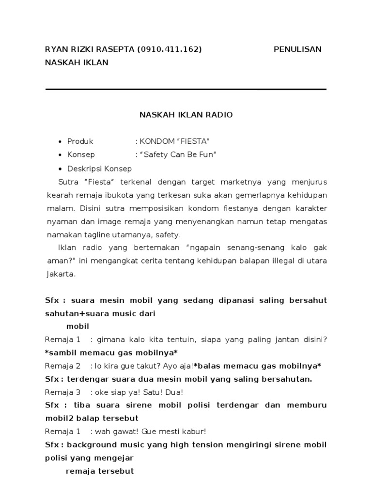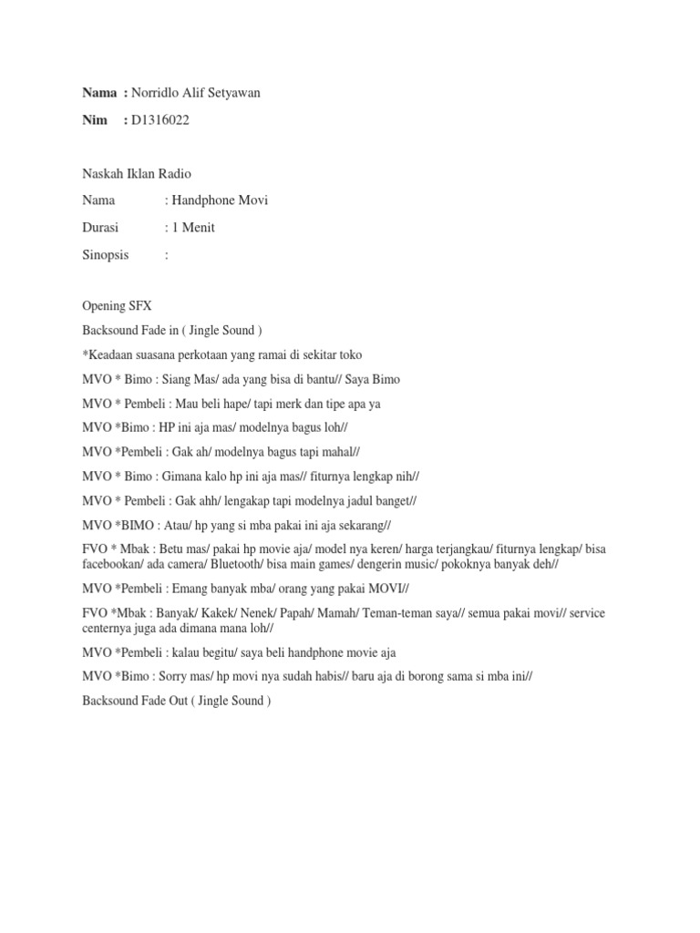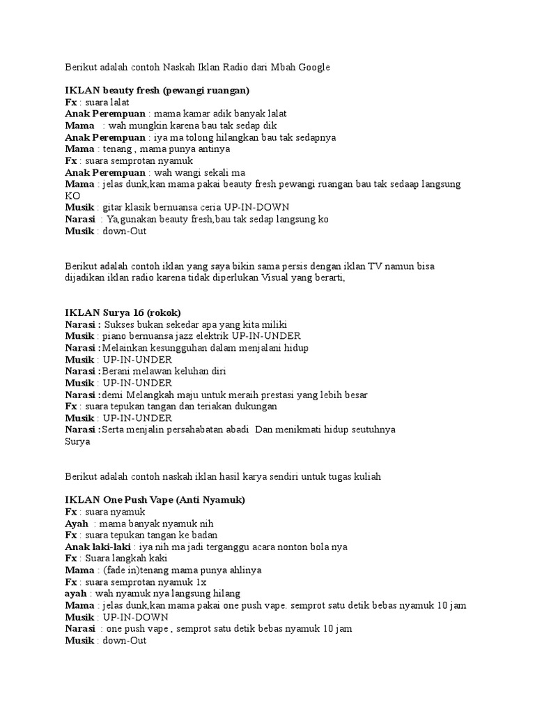 Contoh naskah iklan radio dialog dan monolog. Buatlah naskah iklan radio yang bisa menghanyutkan para pendengar radio alias tidak membuat mereka menggerutu karena iklan buatan anda terasa membosankan atau basi.agar tidak demikian copywriter naskah iklan harus bekerja sama dan harus pintar dalam memilih talent voice over. Contohnya, naskah iklan televisi, radio, majalah, koran, baliho, spanduk, dan lain sebagainya. How to become a good copywriter, how to create good radio commercials, how to build your own agency sekarang sedang belajar mengenai. Contoh naskah iklan radio produk makanan.
