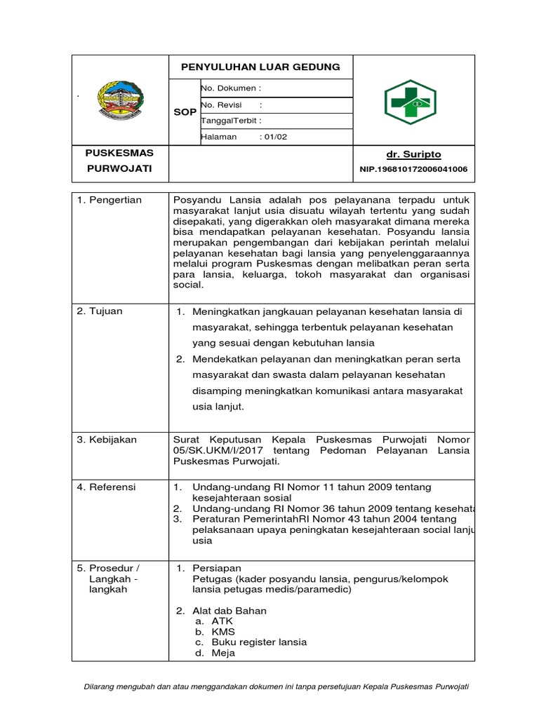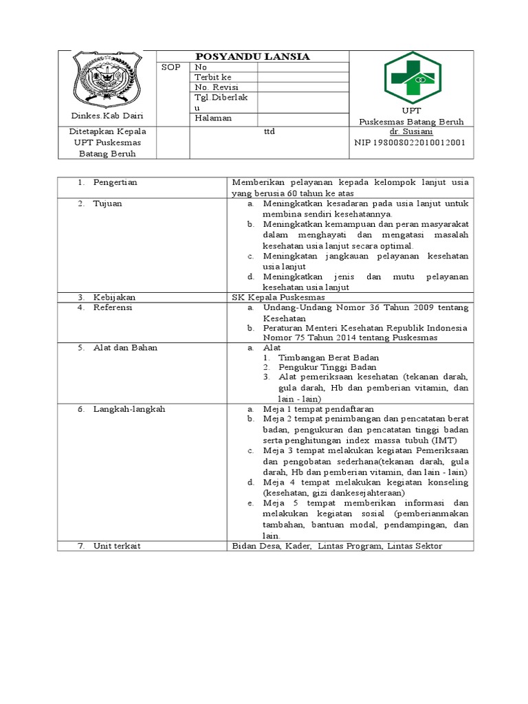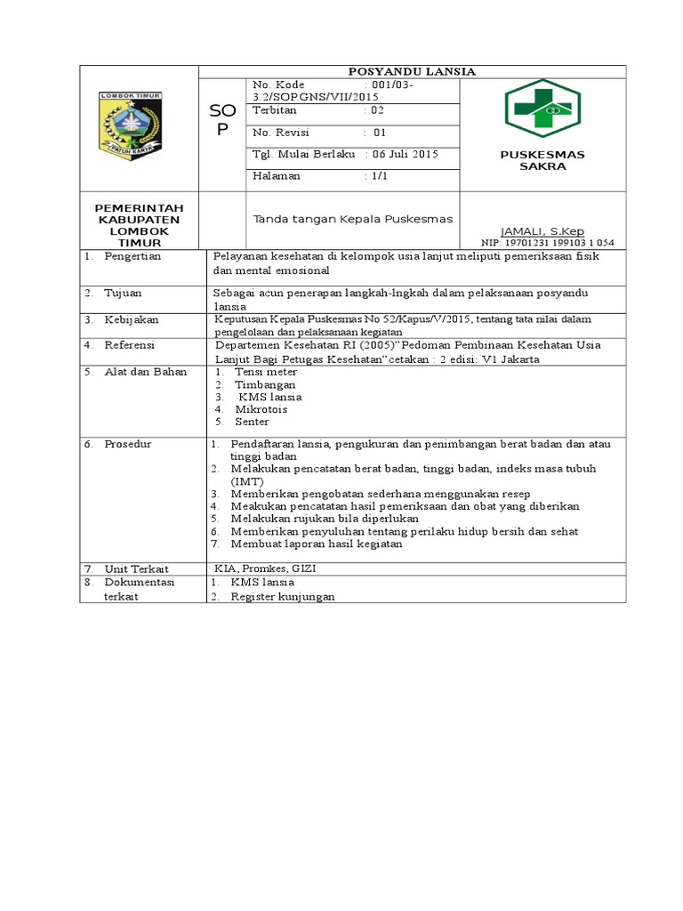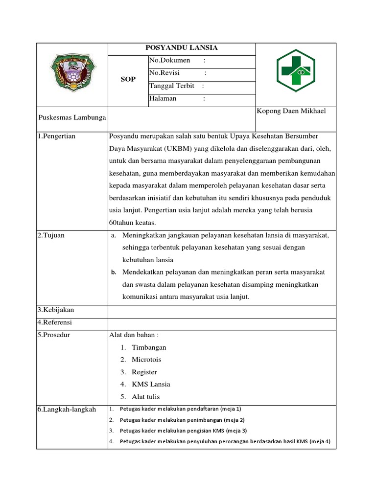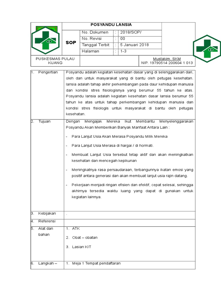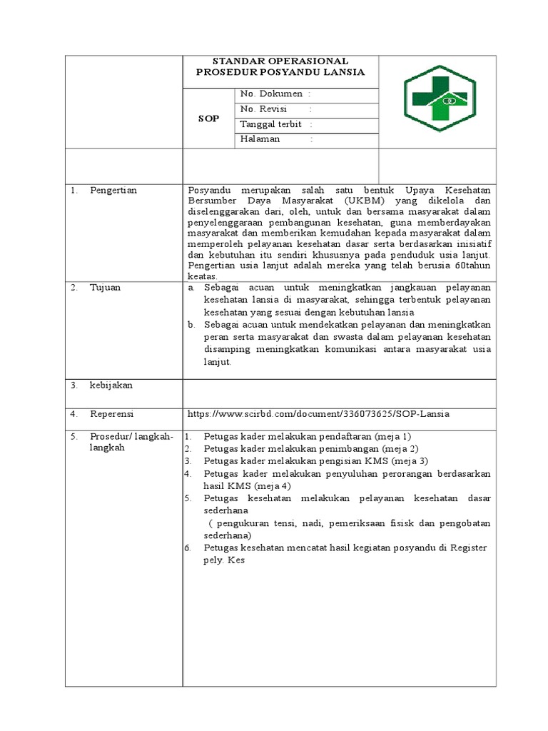 Posyandu lansia sop no.dokumen : Sop phbs tempat kerja (2).docx: Pengisian kartu menuju sehat (kms) posyandu lansia pengertian. Pasal 2 tujuan dari pembentukan posyandu lansia adalah : Kriteria puskesmas santun lansia (1) no item strata 1 strata 2 strata 3 1 akses keluar masuk pasien a.
